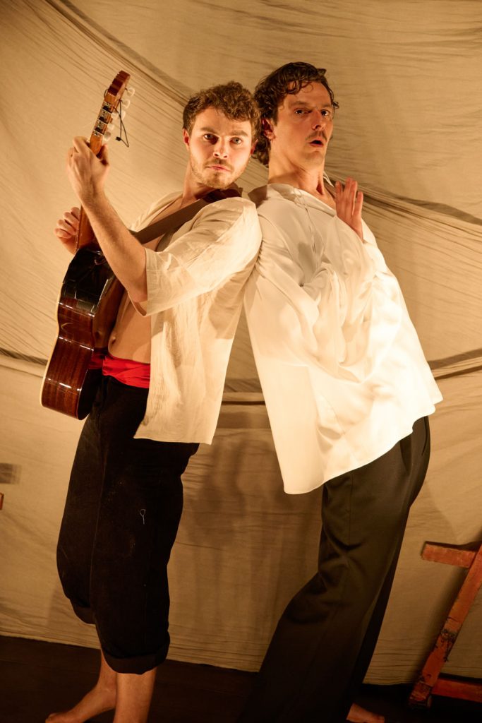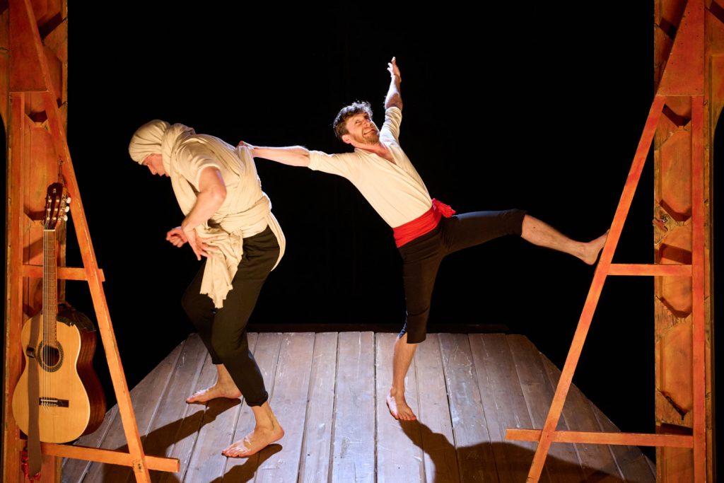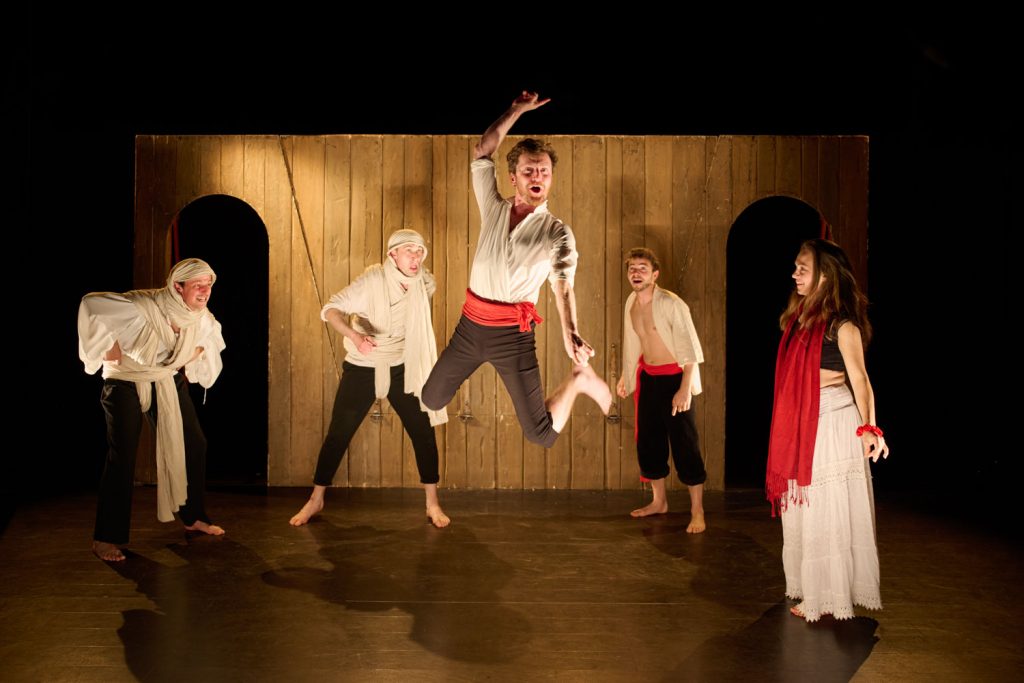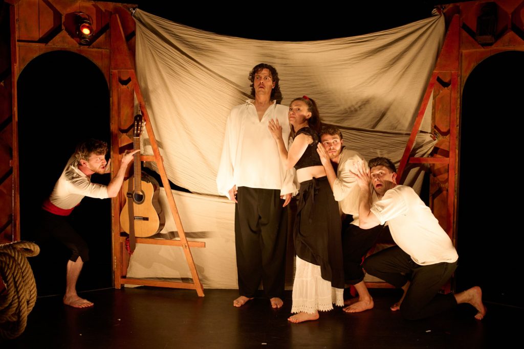 Une troupe de cinq comédiens et musiciens s’empare d’une des comédies les plus drôles de Molière. Dans un rythme endiablé, ils se réapproprient en musique l’esprit du théâtre de tréteaux. Avec le caractère de ses personnages et l’enchainement rocambolesque des situations jusqu’à la réconciliation finale, le texte est pétri de l’esprit de la comédie italienne. Par l’engagement corporel des comédiens, nous ne serons pas loin de la Commedia dell’arte, dans sa vibration, sa bonne humeur communicative et les changements allègres de personnages.